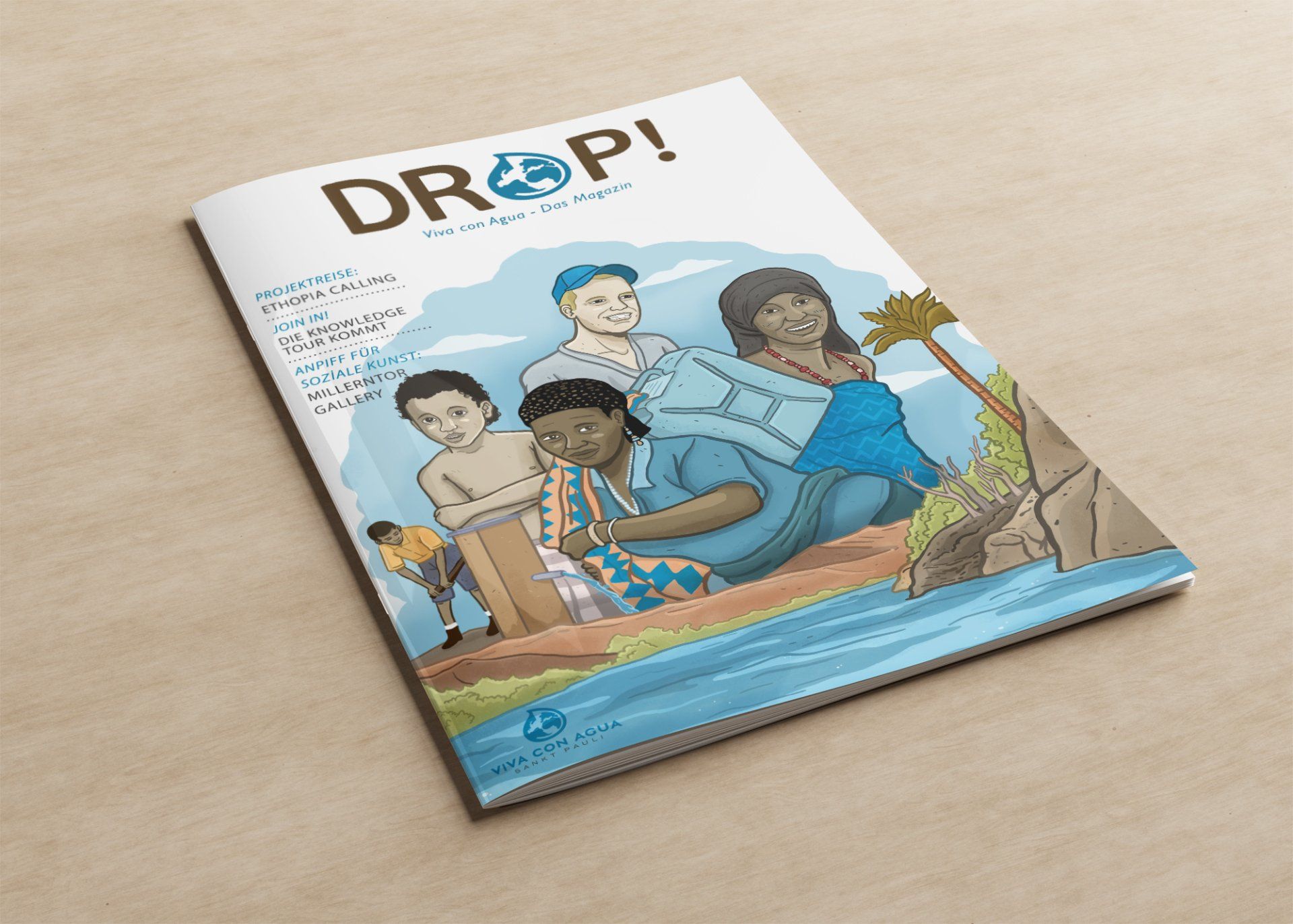 ButtonCoverillustration für das Drop! Magazin von Viva con Agua (Illustration: Andreas Denzer)